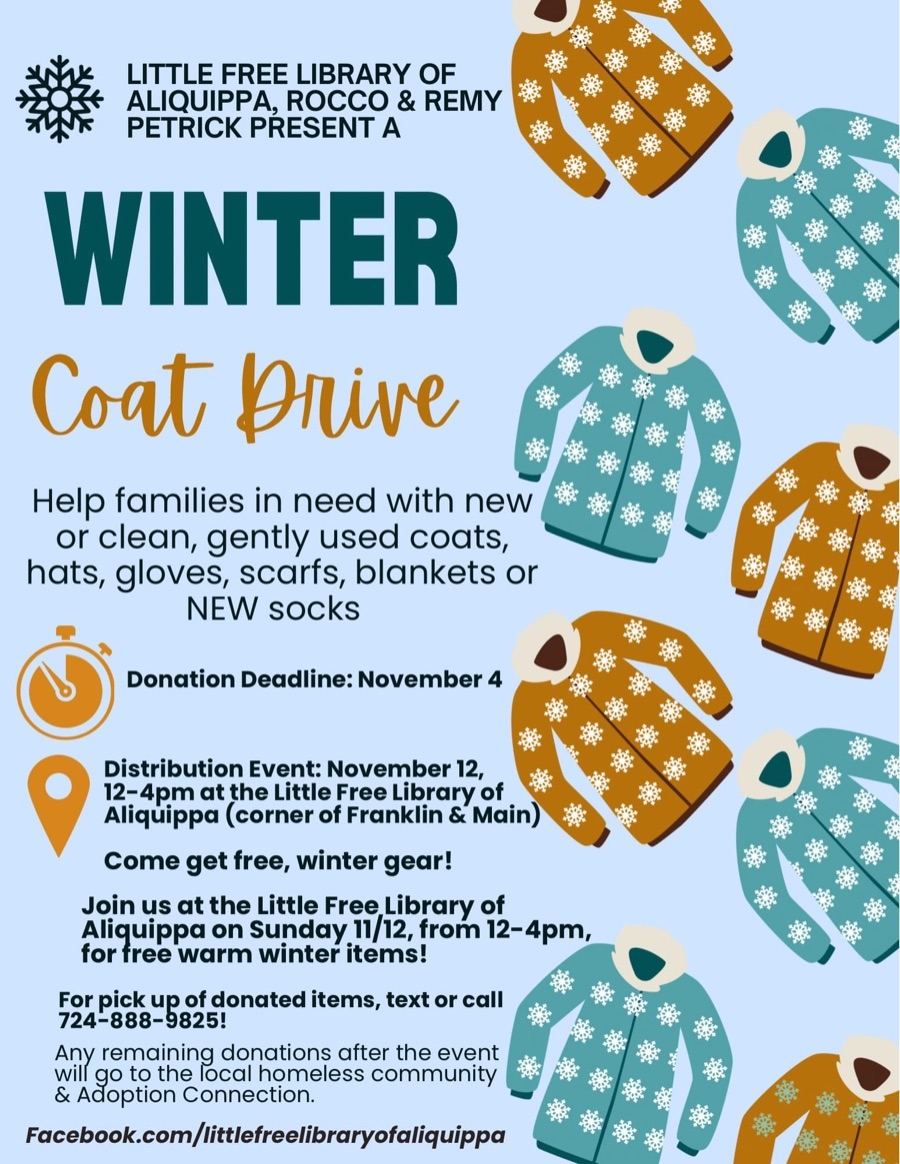 Winter Coat Drive: Nov. 12 from 12–4 p.m. at the Little Free Library of Aliquippa (at the corner of Franklin and Main).