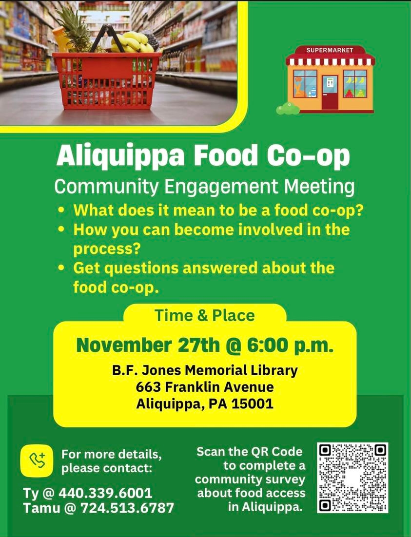 Aliquippa Food Co-Op: Nov. 27 at 6 p.m. at the B.F. Jones Memorial Library, 663 Franklin Ave., Aliquippa. Community engagement meeting to get your questions answered.